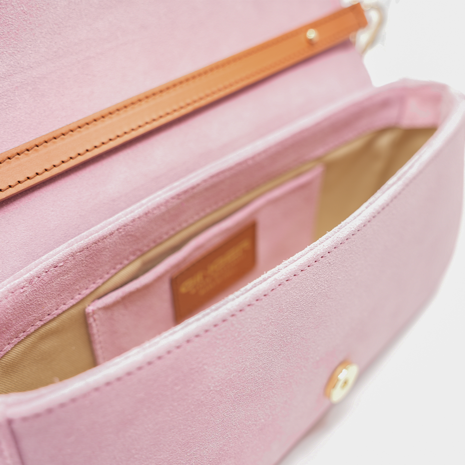 Versatile, urban, with a timeless charm. An easy chic and refined silhouette for the Vicky bag, baguette format, made of soft suede leather and leather finishes. Handcrafted, 100% Made in Italy. The construction is functional with a front flap decorated with a leather plate engraved with the brand logo. Equipped with a shorter rigid leather handle to wear the bag under the arm and a removable and adjustable leather shoulder strap to wear it comfortably even cross body. The internal compartment is lined in cotton gabardine fabric with a flat suede pocket. Magnetic closure.