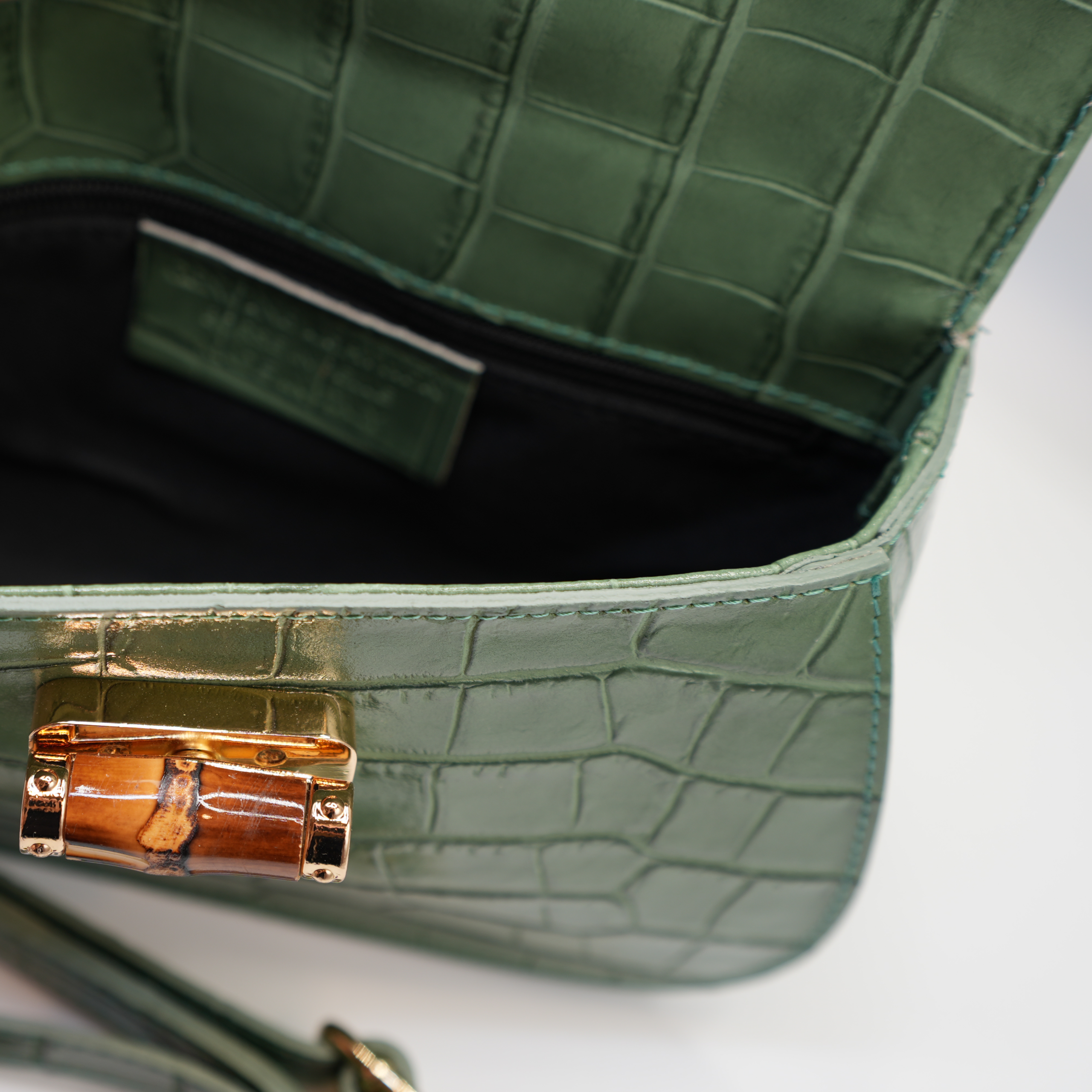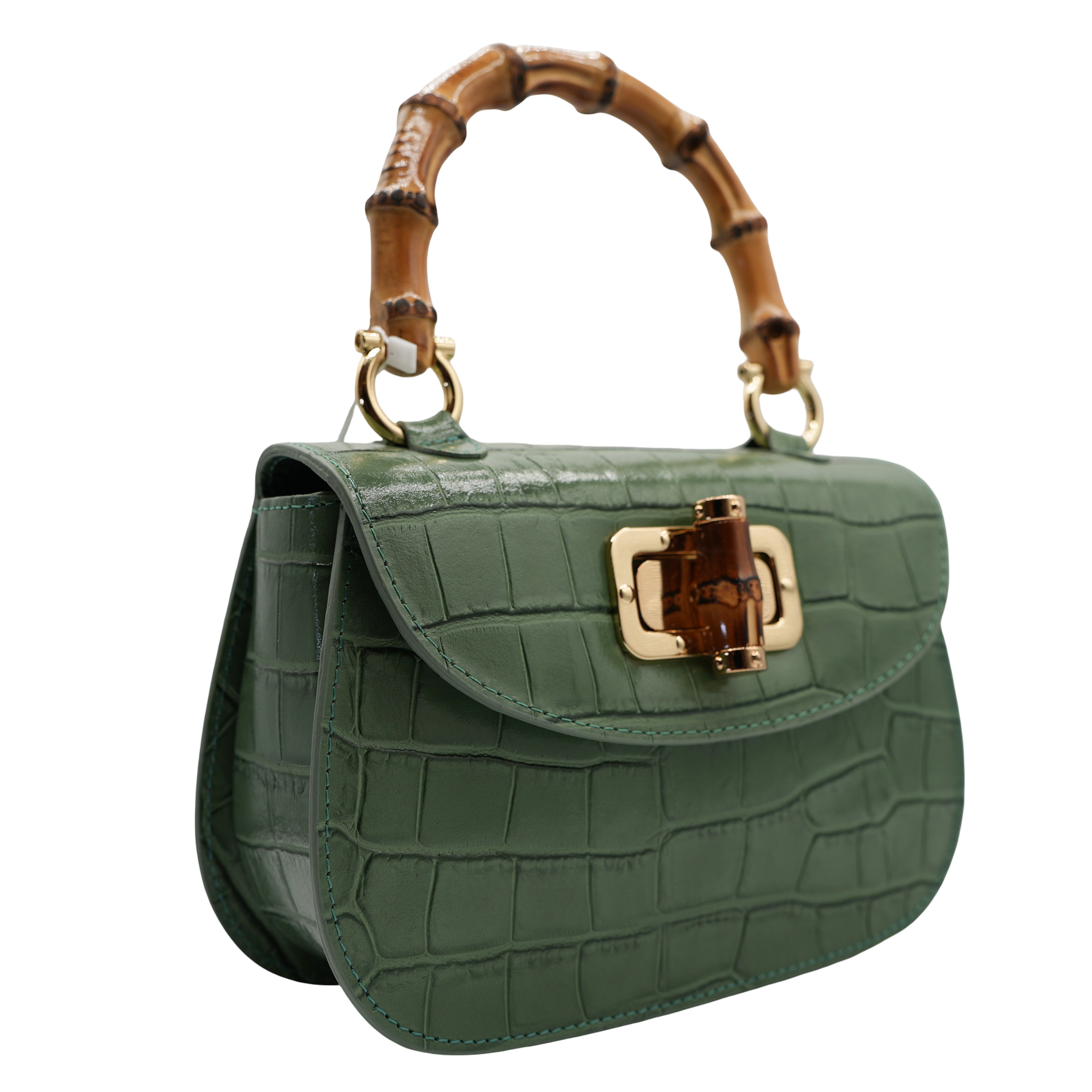 Elegant, refined, with a timeless style. Frida bag is made of shiny effect crocodile-print calfskin, a combination of style and versatility. The geometric lines of the model are finished with a bamboo handle and a twist lock closure with light gold-plated bamboo. Equipped with an adjustable leather shoulder strap for a double styling option. Made in Italy.