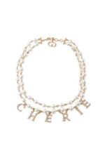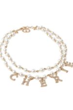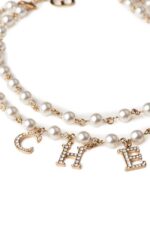 Un intreccio di fili di perle avvolge gli charm composti dalle lettere che formano la sigla CHERIE, illuminate da un pavé di piccoli cristalli Swarovski.