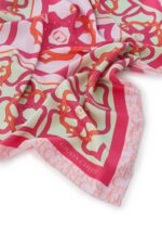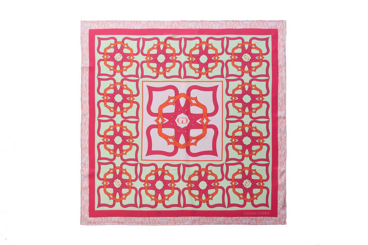 Lussuoso foulard in twill di seta 14 momi decorato con stampa EsaFlos, un pattern geometrico di elementi floreali intrecciati.